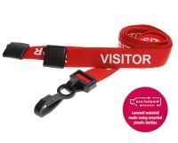 These 15mm Visitor Lanyards with Plastic J-Clip are made of recycled PET material printed with “Visitor" text in white along the length of the lanyard. They come in a standard 90cm length (45cm adult drop length) with a safety breakaway feature and plastic J-clip for attachment.