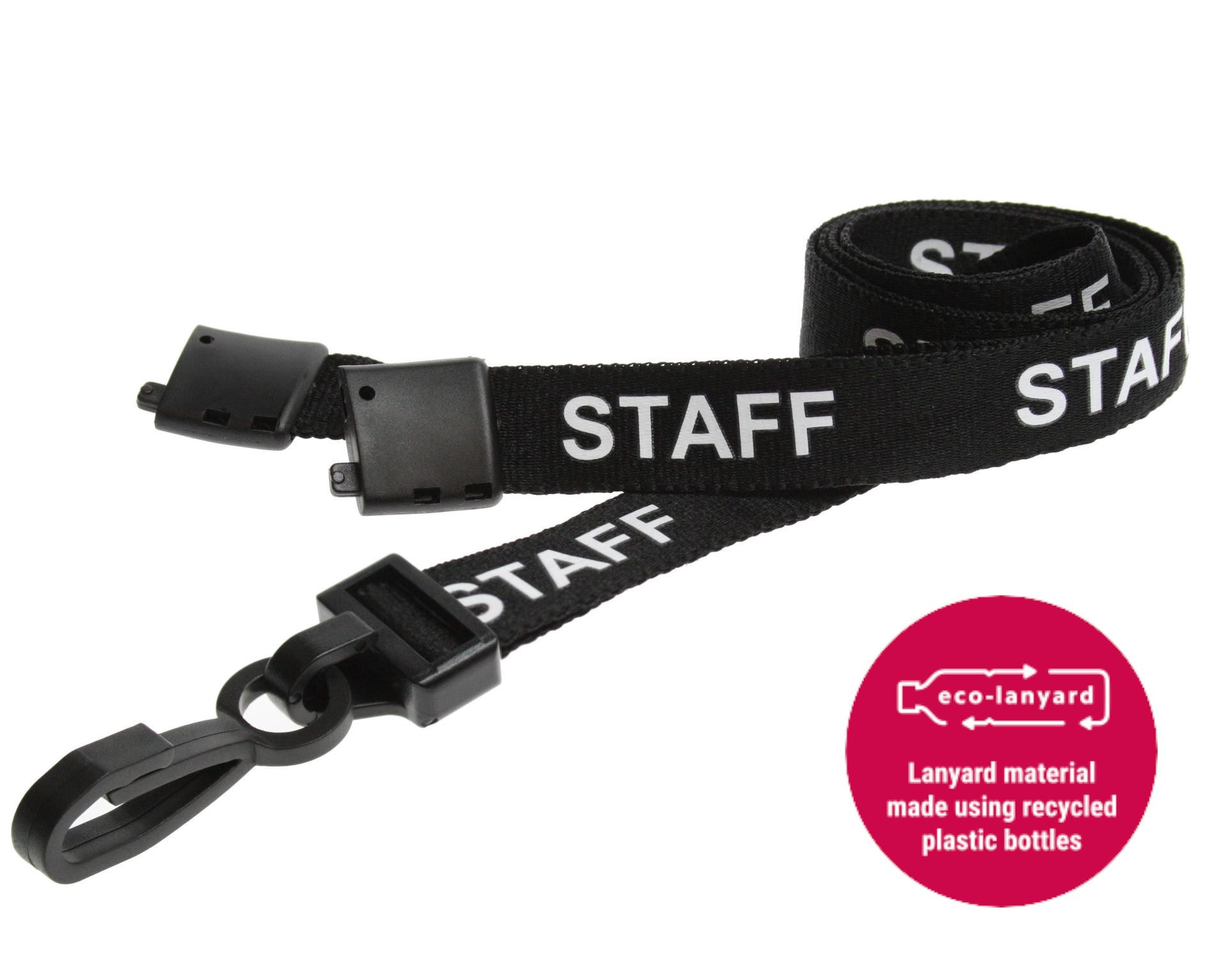 These 15mm Staff Lanyard with Plastic J Clip are made of recycled PET material printed with “Staff” text in white along the length of the lanyard. They come in a standard 90cm length (45cm adult drop length) with a safety breakaway feature and plastic J clip attachment for cards, passes, and tokens.