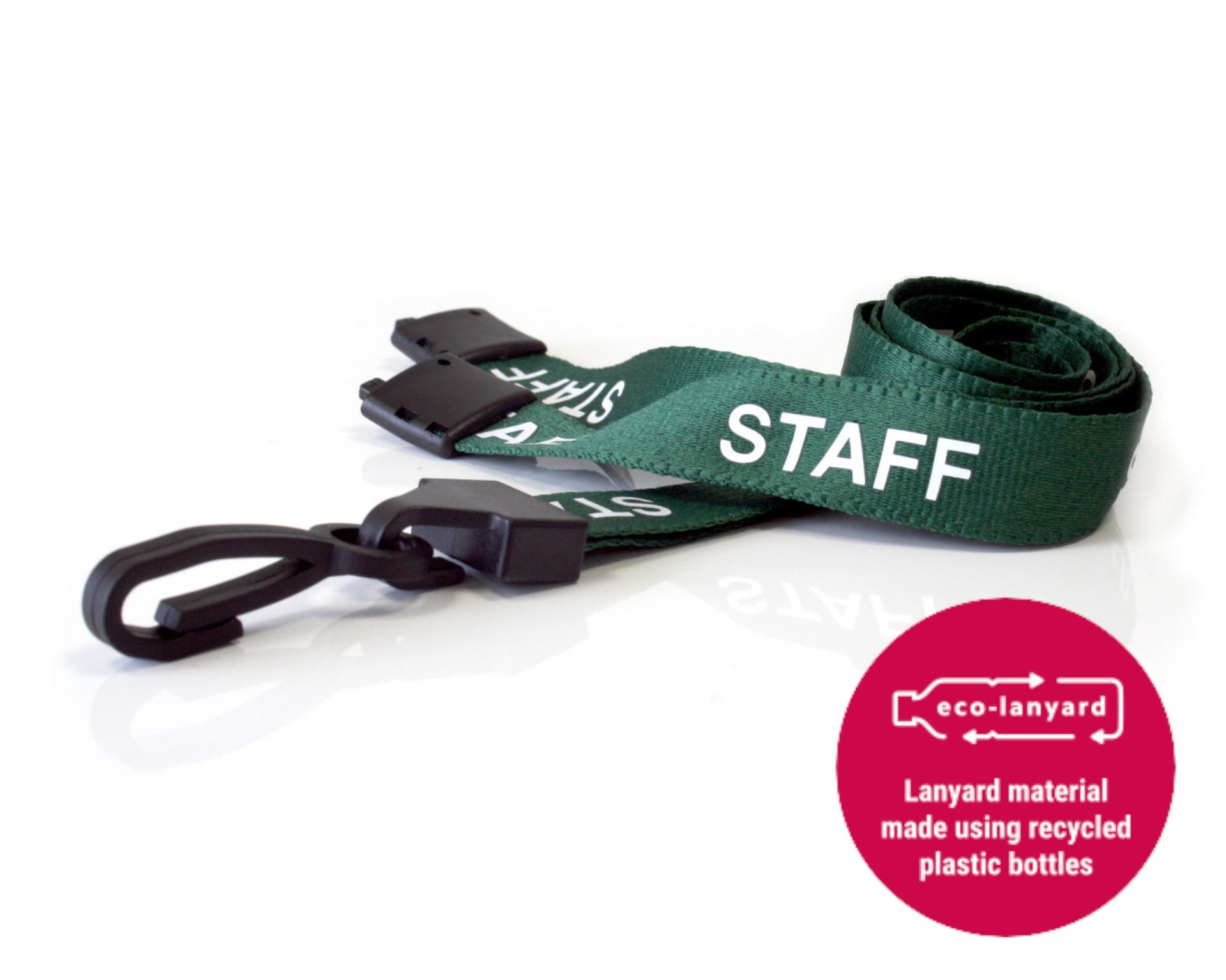 You Are Here: Home > Lanyards > Pre-printed Lanyards > Staff Lanyards > 15mm Recycled Green Staff Lanyards with Plastic J Clip (Pack of 100)