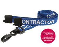 These 15mm Blue Contractor Lanyards with Plastic J-Clip are made of recycled PET material printed with “Contractor” text in white along the length of the lanyard. They come in a standard 90cm length (45cm adult drop length) with a safety breakaway feature and plastic j-clip for attachment.