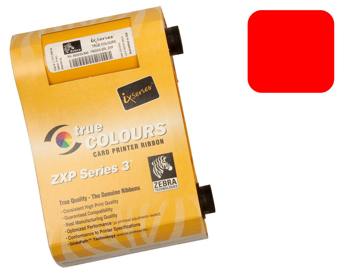 The Zebra 800033-802 Red Ribbon is a monochrome resin dye in a vibrant red tone compatible to use for Zebra ZXP Series 3 card printers. This ribbon is ideal for printing up to 1,000 ultra-crisp texts and single-line images onto pre-printed plastic cards or blank coloured cardstocks.
