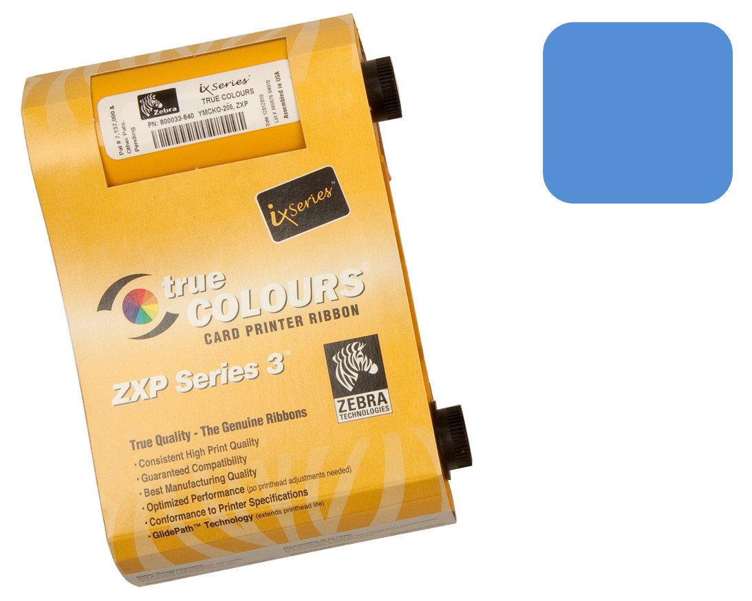 The Zebra 800033-804 Blue Ribbon is a monochrome resin dye in a vibrant blue tone compatible to use for Zebra ZXP Series 3 card printers. This ribbon is ideal for printing up to 1,000 ultra-crisp texts and single-line images onto pre-printed plastic cards or blank coloured cardstocks.