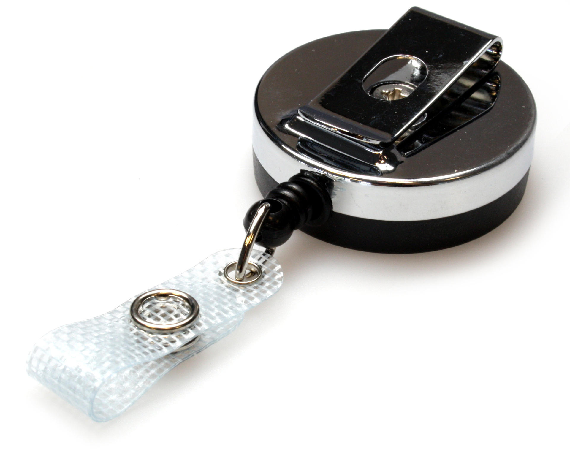 Heavy Duty 41mm Diameter Badge Reel with Black Plastic Front & Chrome Back, Belt Clip, 80cm Nylon Cord and Re-inforced Strap Cli