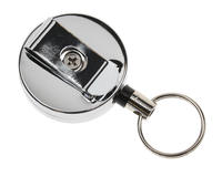 The Chrome ID Badge Reel in a chrome finish comes with a retractable key ring that securely holds ID cards, badges, and key fobs. It safely attaches to the end user through its built-in metal belt clip.