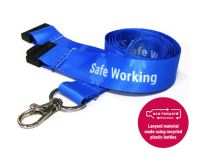 Social distancing 20mm width lanyards with social distancing reminders written in white on both sides of the lanyard to remind employees of social distancing guidelines. As well as being eco-friendly, these lanyards include a safety breakaway and metal trigger clip to easily attach ID cards.