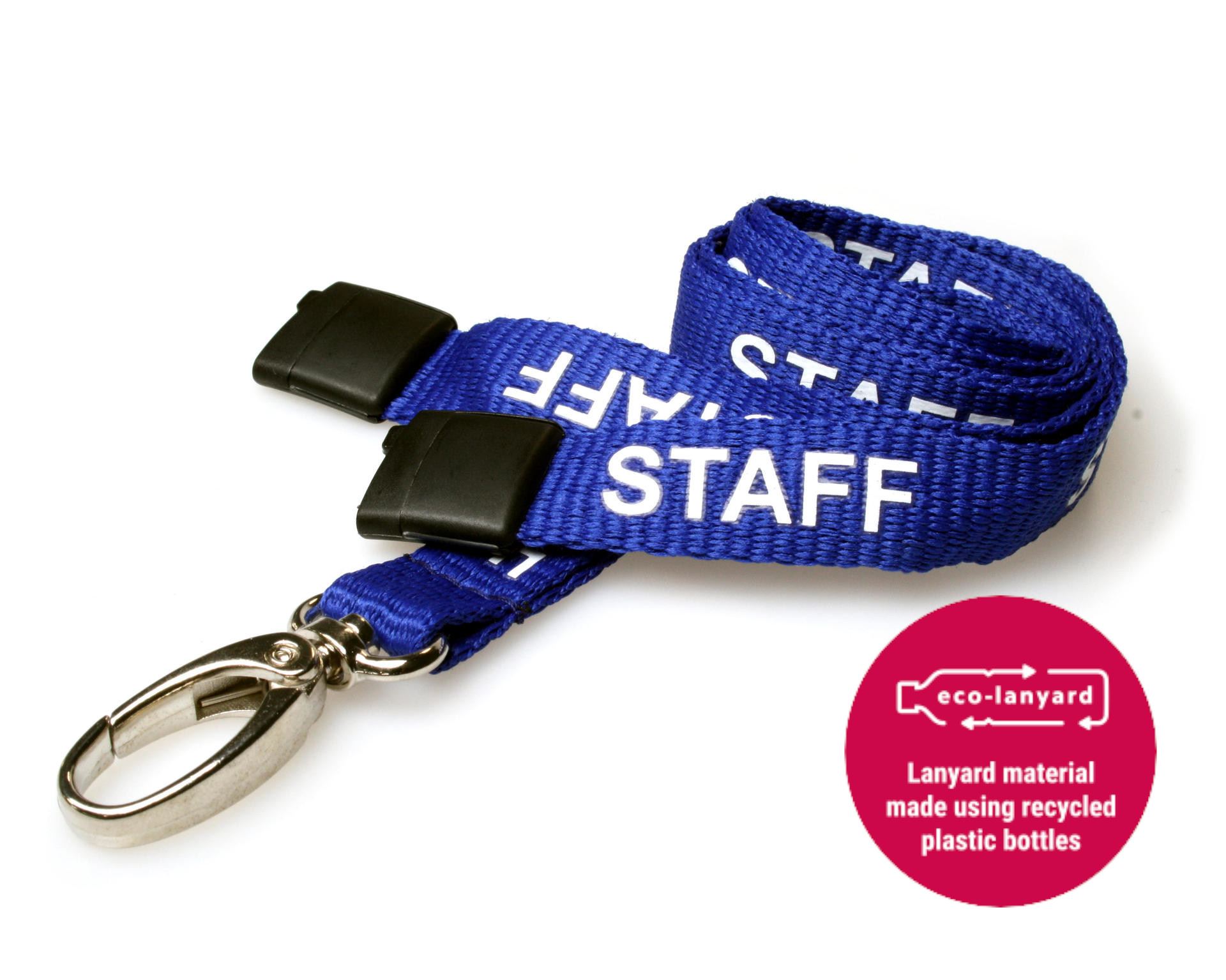 These 15mm Staff Lanyards with Metal Lobster Clip are made of recycled PET material printed with “Staff” text in white along the length of the lanyard. They come in a standard 90cm length (45cm adult drop length) with a safety breakaway feature and plastic J clip attachment for cards, passes, and tokens.